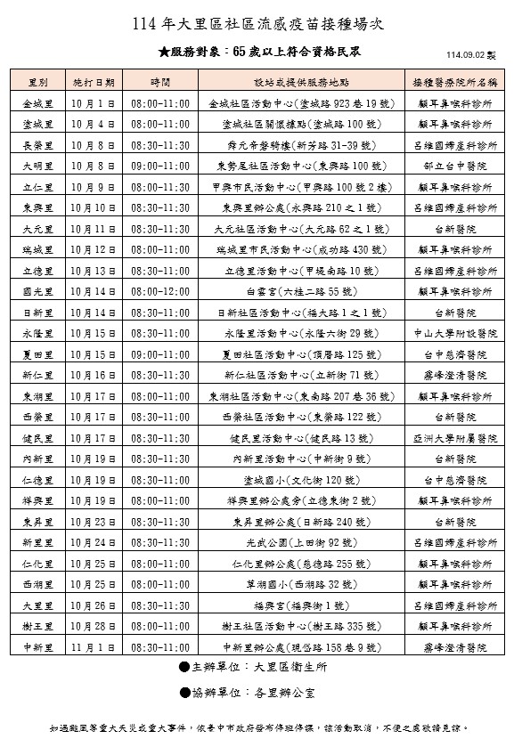 114 年大里區社區流感疫苗接種場次 114年度流感及新冠疫苗--社區接種站公告 一、接種對象:65歲以上民眾【49年次(含)以前】 二、攜帶證件:健保卡 三、社區接種站場次: 附件1 注意事項: 1.曾接種新冠疫苗,需與前一劑疫苗施打間隔12週(84天)以上。 2.流感及新冠疫苗可與其他疫苗同時或間隔任何時間接種。