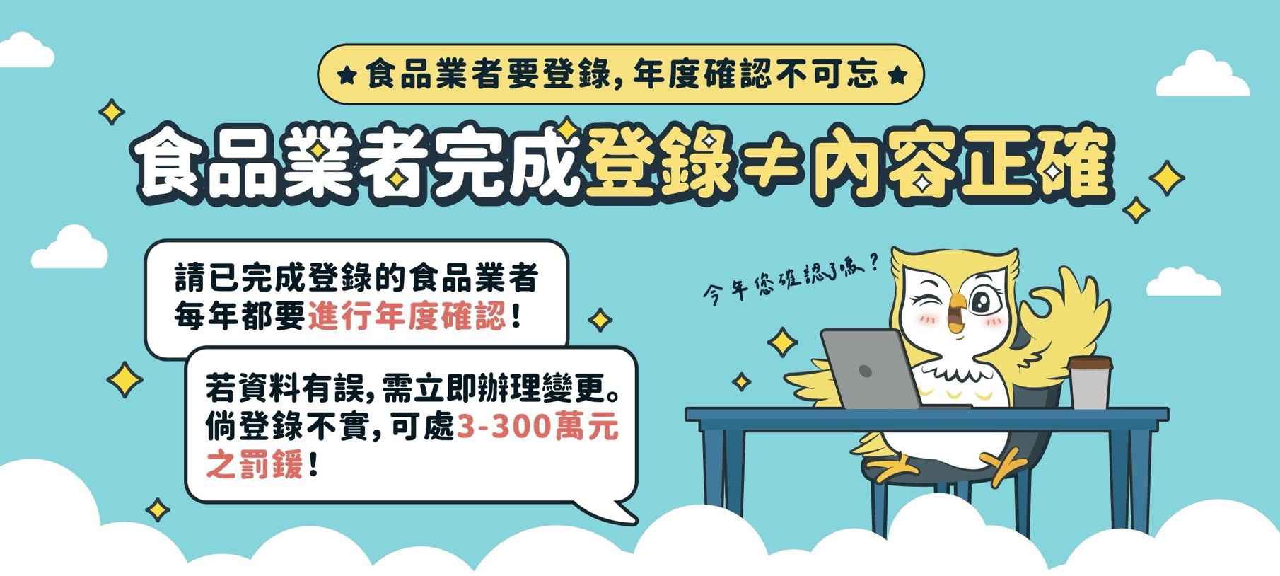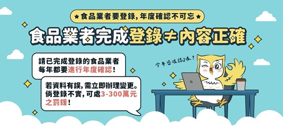 ◎為維持登錄內容之正確性,登錄內容如有變更,食品業者應自事實發生之日起30日內申請變更登錄;登錄內容即使無變更,食品業者依規仍應於「每年確認」其登錄內容正確性。登錄不實者,依法可處新臺幣3萬元以上300萬元以下罰鍰。