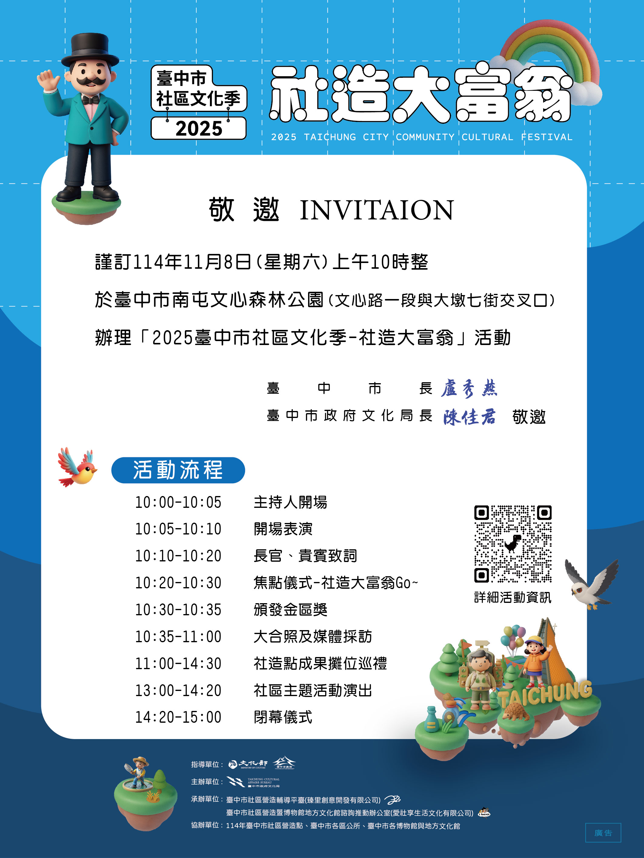 台中市政府文化局訂於114年11月8日(星期六)辦理「2025臺中市社區文化季-社造大富翁」活動,串聯114年度社造點、各區公所、社區大學等,共同呈現社區的主題特色,於本市文心森林公園南側溜冰場(文心路一段與大墩七街交叉口)上午10時至15時舉行,敬邀大家踴躍參加。