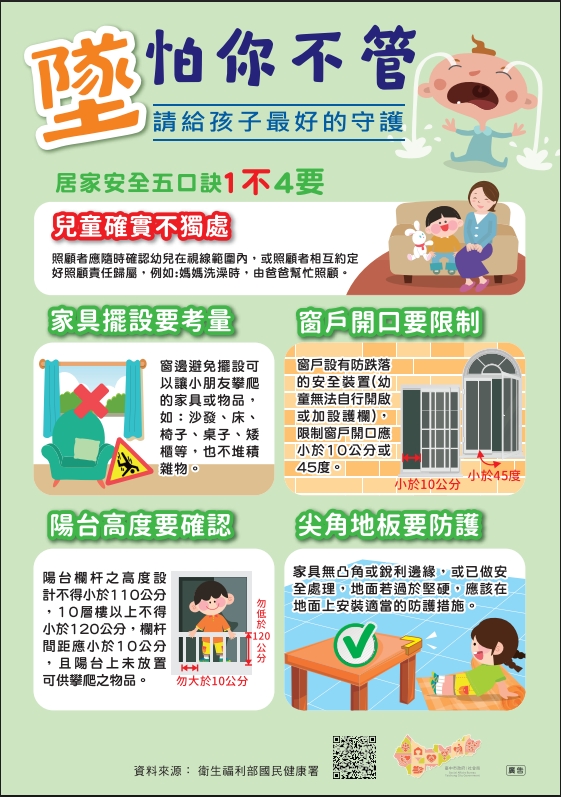 墜怕你不管 「家」是兒童最常活動的地方,卻也是事故傷害發生最多的場所。兒童事故傷害的發生,常因輕忽周遭環境的安全引起,為讓家中小孩有個安全的居家環境,避免發生事故傷害,居家安全五口訣-1不4要:1不:兒童確實不獨處1要:家具擺設要考量2要:窗戶開口要限制3要:陽台高度要確認4要:尖角地板要防護 臺中市大里區衛生所 關心您的健康諮詢電話:04-24061500#21 莊護理師