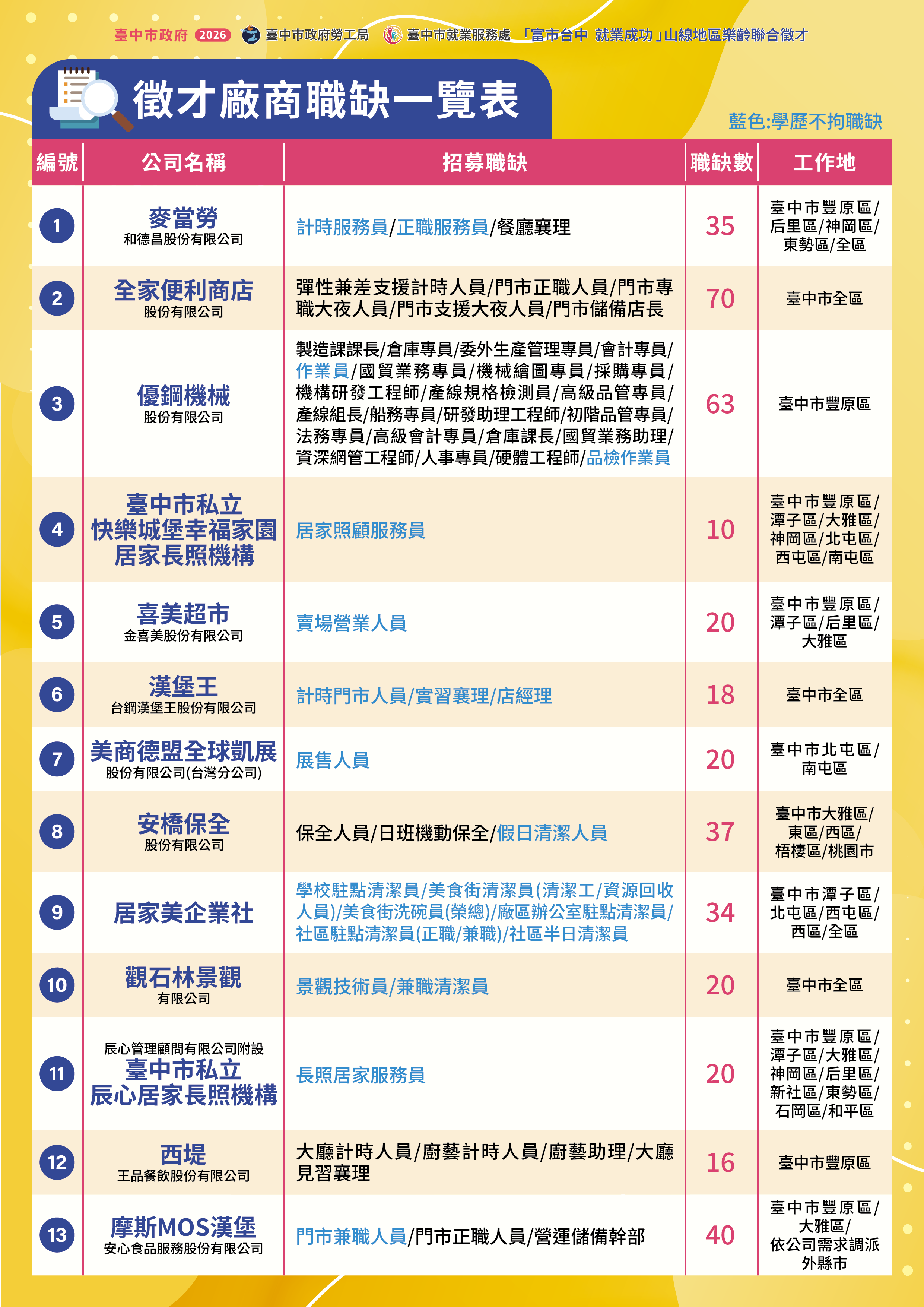 「臺中市政府勞工局於4/29(三)上午10時至下午2時在陽明市政大樓舉辦『山線地區樂齡聯合徵才』,邀請王品、麥當勞、全家及美商德盟等13家友善企業,提供逾400個職缺,歡迎參加」。